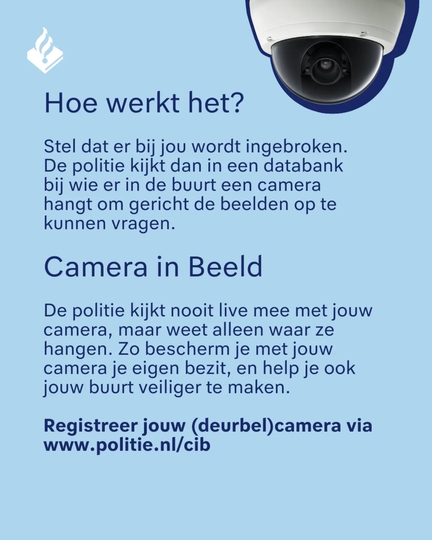 Door uw camera aan te melden bij camera in beeld weten wij waar er camera’s hangen zodat wij gerichter buurtonderzoeken uit kunnen voeren en meteen weten waar wij de meeste kans hebben op concrete informatie zoals beelden. Wij kunnen niet live meekijken. Het gaat vooral om de locatie van de camera. Hoe beter de politie in kaart heeft waar camera’s hangen, hoe sneller zij kan werken aan het oplossen van misdrijven in jouw buurt.